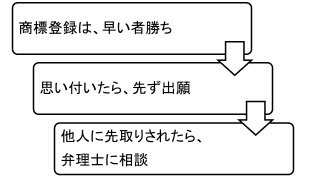 が、他人より先に、商標登録出願をすることです。商標登録は、早い者勝ちなので、他人より先に、出願してし