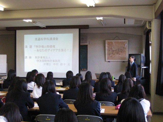 加茂農林高等学校の流通科学科の第2学年及び第3学年の78名を対象に、知的財産権のうち、特に特許と商標について講義しました。流通科学科3年生は、岐阜県の「飛び出せスーパー専門高校生」プロジェクトとして、地域と連携してインテリア花壇苗などの商品開発を進めています。このため、こうした商品と関連が深い特許と商標についての講義依頼を受けていました。講義内容は、発明は商品開発のどういった過程において生まれるのか、どういう場合に特許になるのかといった点、商品流通や販売において、いかに商標が重要であるかという点について、具体例を挙げつつ説明しました。最近では、高校の授業内容も実践的内容を含めるようになってきており、予め基礎知識があった生徒さんもいたため、おおよそ関心を持って聞いている様子でした。また、特に3年生においては、前記プロジェクトの商品開発のためのリサーチや実験も行ってきているため、発明、商標これらの出願に関し、具体的な質問がありました。高校生と特許権とは、なかなか結びつかないようにも思っていましたが、商品開発を行っているということで、発明者意識や権利者意識もきちんともっているようで、とても頼もしく感じました。