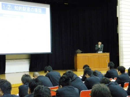 将来、日本の経済の担い手となる工業高等学校生徒に、特許権や商標権等の基礎的知識についての教育を実施し、知的財産の創造、保護及び活用などの理解を深めるとの目的の下、知的財産の基礎知識について講義しました。具体的に、身近な事例(自動車や携帯デジタルプレーヤー)を取り上げて、特許と商標を中心に話をしました。生徒の方には特許等は案外身近であると感じて頂いたと思います。工業高校の3年生でしたのでメーカーに就職される方も多く、就職後に生かしていただけたらと思います。